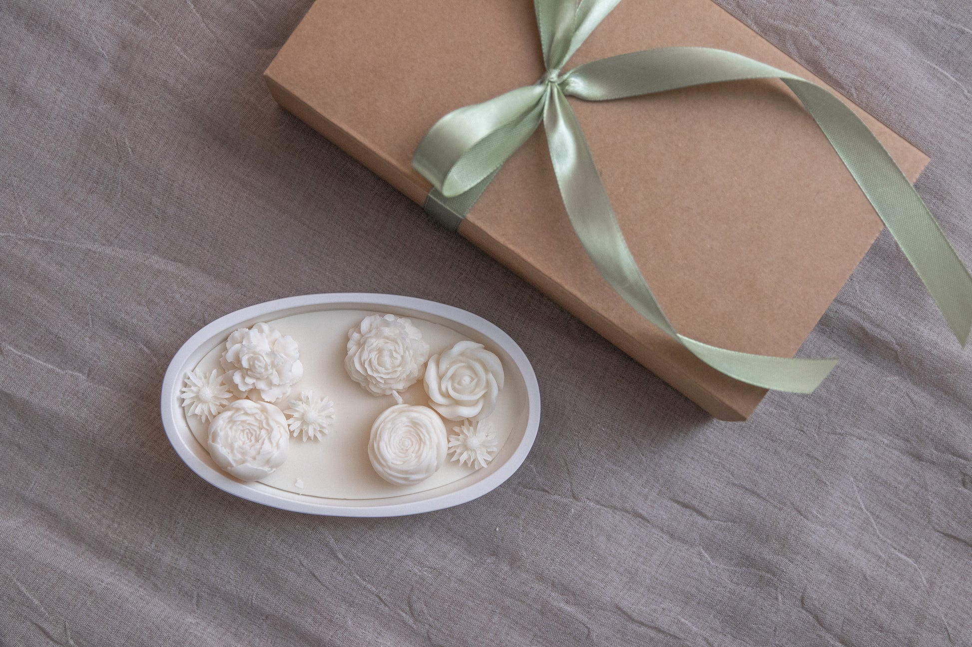 Ein stilvolles Deko-Highlight: Die ovale Schale aus hochwertigem Gussmaterial ist mit einer glatten Wachsfläche gefüllt, auf der zarte Wachskerzen in Form von Rosen und Blüten erblühen.